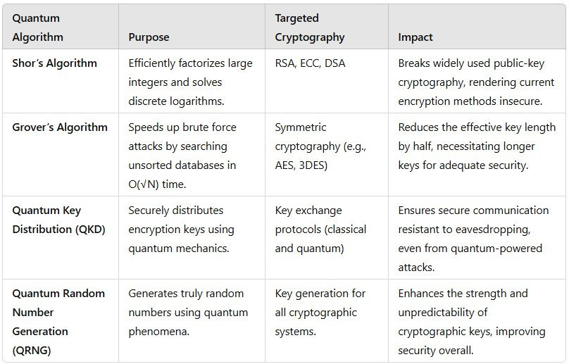This quantum algorithm can efficiently factor large integers, breaking RSA and ECC encryption. A strong RSA-2048 key, secure today, could be cracked in hours by a powerful quantum computer.