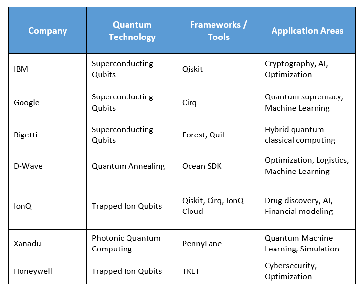 Coding Frameworks/Tools: The programming platforms or SDKs companies provide for developers to build quantum applications.